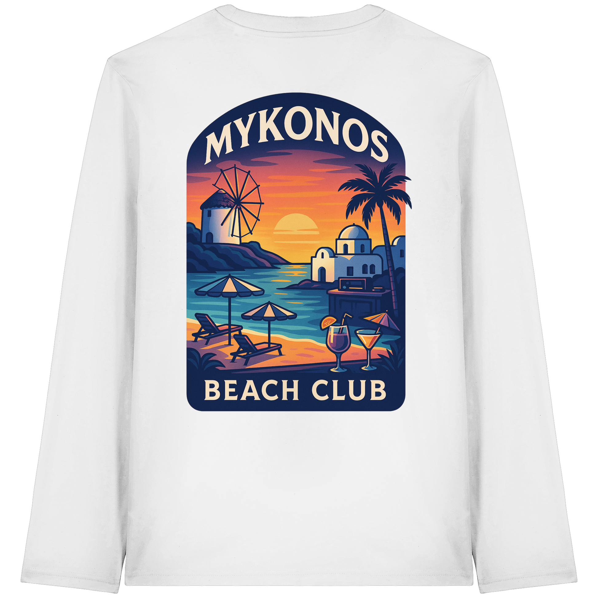 Erlebe das Gefühl eines lauen Sommerabends auf Mykonos mit unserem 'Destination Mykonos - Organic Longsleeve T-Shirt'. Das großformatige Rückenmotiv entführt dich in eine detailreiche Sunset-Szene mit Windmühle, Kuppelkirche, Palmen und einem DJ-Booth, eingerahmt von warmen Orange- und Türkistönen im retro-inspirierten Travel-Poster-Look.